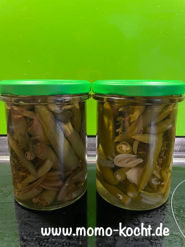 In einem Topf alle Zutaten für den Sud geben und aufkochen lassen, dies dann noch kochend in die Gläser füllen. Wichtig ist bis oben an den Rand! Dann die Gläser verschließen und 5 Minuten umgedreht hin stellen. Danach kann man sie wieder umdrehen und auskühlen lassen. Nun sollten sie für mind. zwei Wochen in den Kühlschrank ziehen. Danach sind sie ca. ein Jahr im Kühlschrank haltbar.