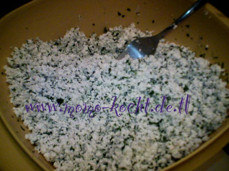 Den Schafskäse zerbröseln (geht gut mit einer Gabel) und mit der Petersilie mischen.