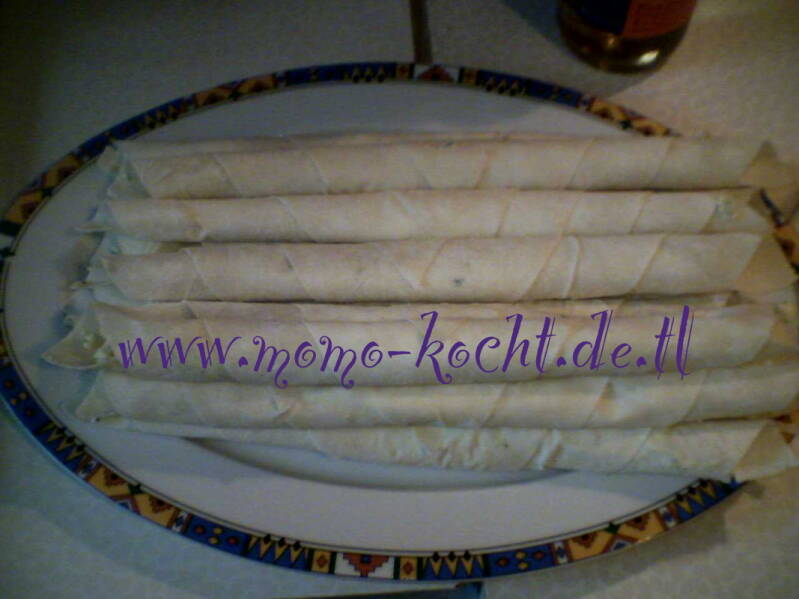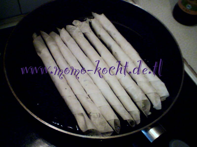 In einer Pfanne etwas Öl heiß werden lassen und darin die Teigrollen braten bis sie knusprig sind. Es ist am besten erst alle Teigrollen zu rollen und dann erst die Pfanne zu erhitzen, sonst wird es etwas stressig.