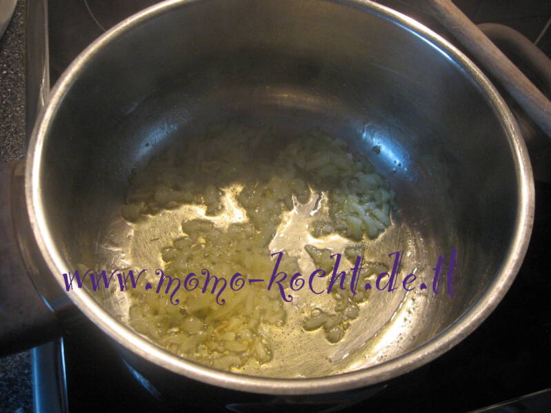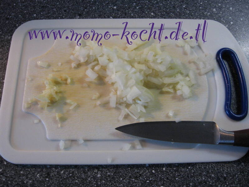In der Zeit den Knoblauch ganz fein schneiden und die Zwiebel in feine Würfel schneiden und dann in einen Topf mit Öl geben und glasig anbraten.