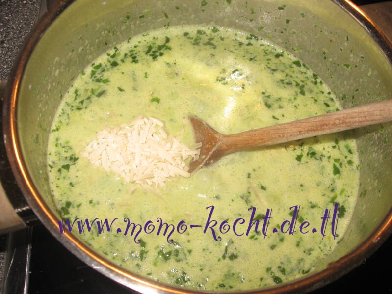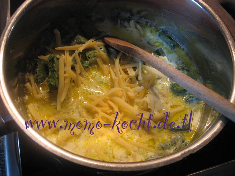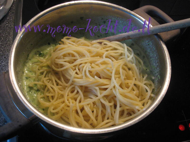 Dazu kommt dann der Spinat, die Sahne, der Käse und die 2 EL Wasser (am besten den weißen Schaum) von den kochenden Nudeln.