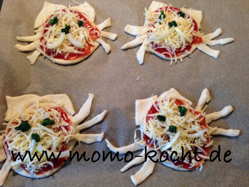 Aus den Spinatkügelchen werden jetzt Augen und Nase und aus den Zwiebeln wir der Mund in dem man jeweils 2 Hälften nimmt.