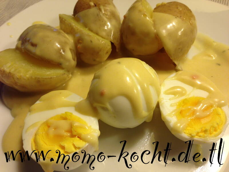 Wer mag kann die Eier in die Soße geben, ich habe die Eier und die Kartoffeln auf die Teller verteilt und dann mit der Soße begossen.